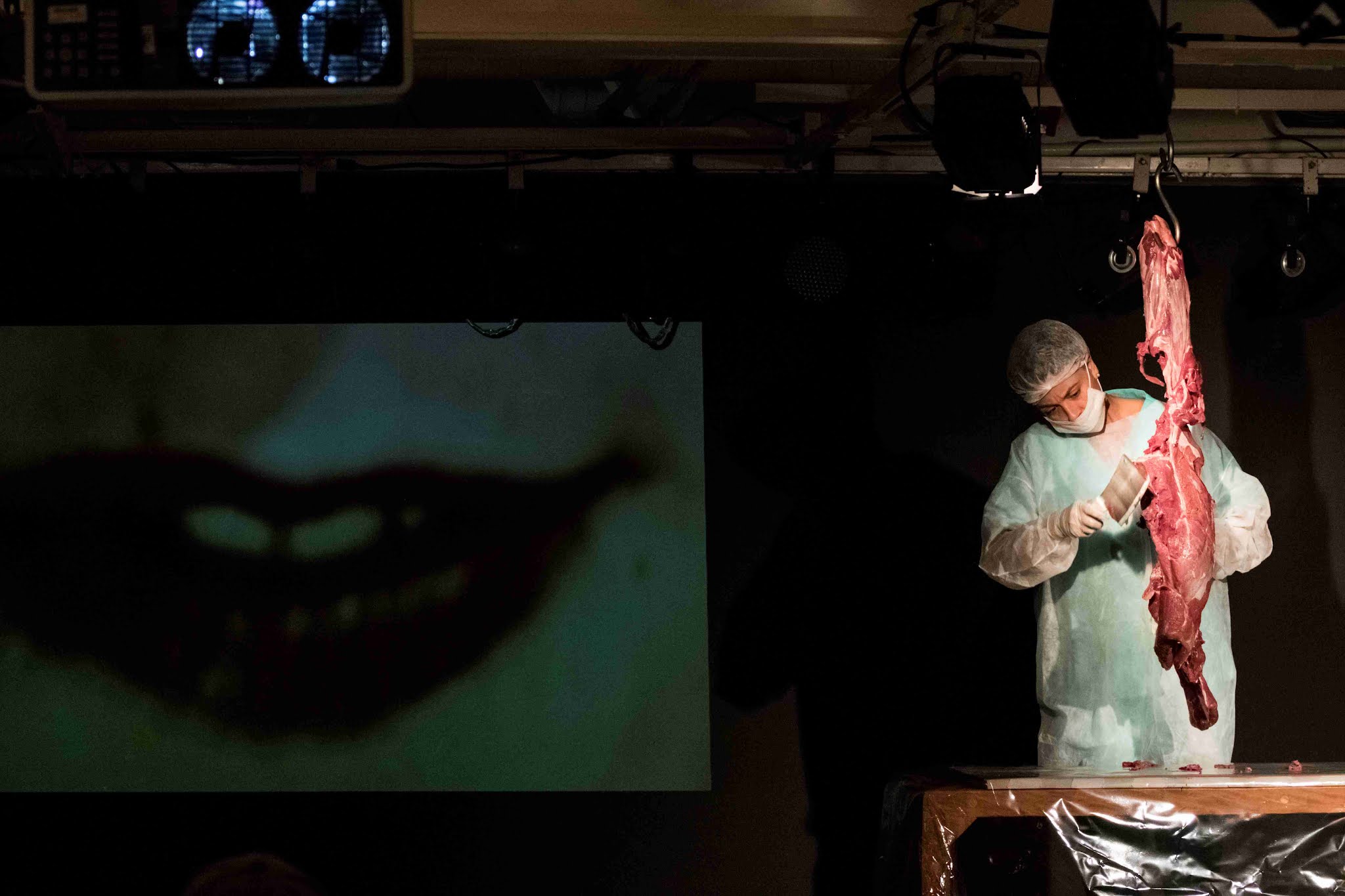 A performer e videoartista paulistana Estela Lapponi, que tem no centro de sua investigação o discurso do corpo com deficiência, começa as apresentações da sexta (29), com B.U.N.I.T.A.S. Composta por ação ao vivo – a performer vestida com uma indumentária de cirurgiã, corta sem parar, com um cutelone, um grande pedaço de carne crua pendurado – e instalação visual – projeção de um vídeo documentário, com fotografia fechada em bocas de sete mulheres cis, que descrevem suas vulvas e como gostam de tocá-las -, a performance propõe uma nova narrativa em resposta à ninfoplastia – prática cirúrgica de “correção” da vulva. Participam da obra Angélica di Paula, Cristina Maluli, Juliana Fierro, Luanah Cruz, Paula Cohen, Thais Ponzoni e Vanessa Moraes.